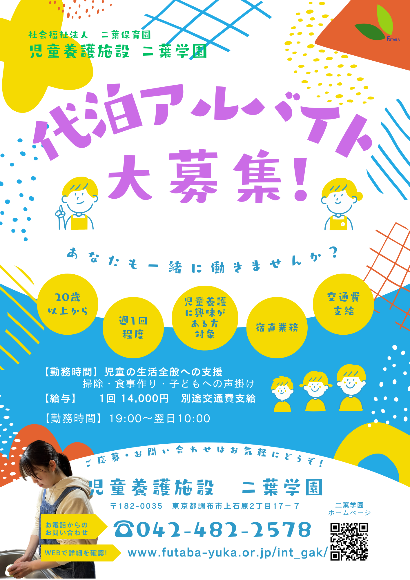 二葉学園では、児童養護施設に興味があり、意欲のある学生や地域の方等を対象にグループホーム等での宿直のアルバイトを募集しています。