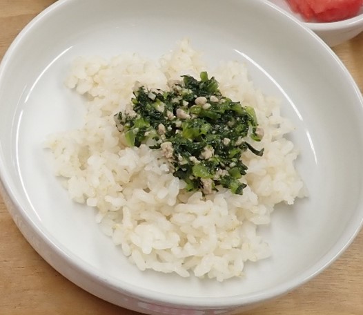 小松菜と挽肉のふりかけ ~乳児~ 2025年09月29日 レシピ通信 材料 (小松菜1茎分) 小松菜 50g(1茎) 豚ひき肉 25g ごま油 1g ★塩 2g ★みりん 5g(小さじ1) ★片栗粉 少量 作り方 1 小松菜を茹でて、よく水気を絞りみじん切りにする 2 フライパンにごま油をひき、ひき肉をほぐしながら炒める 3 小松菜を入れ軽く炒める 4 火を止め、★を加え全体をよく混ぜてから火をつける 5 1~2分混ぜながら炒める
