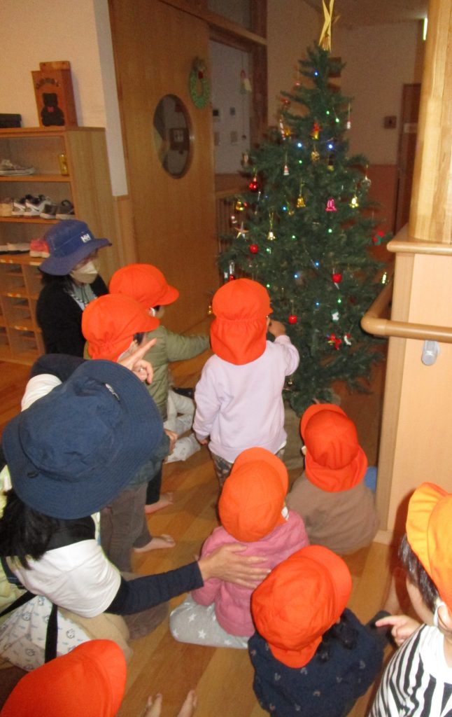 この季節になると、事務所の前には綺麗な電飾で光るクリスマスツリーがあります。子どもたちはツリーの前を通る度に、「星あるね~!」「きれいだね~」と装飾を見て目を輝かせながらじっくりと見ています。