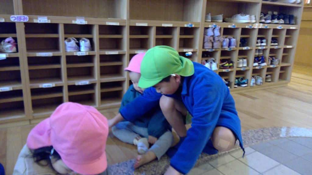 靴下や靴の着脱を介助したり、手を繋いで散歩へ出掛けたり、一緒に食事をしたり、お昼寝の時間には寝かしつけのトントンをしたり・・・みんな“小さな先生”になって頑張っていました。ゆり組さんに話を聴いてみると「緊張した」「可愛かった」や、誇らしげな表情で腕を指差して「しばらくトントンしていたから腕が痛い(笑)」などの感想があり、有意義な異年齢交流の機会になりました。