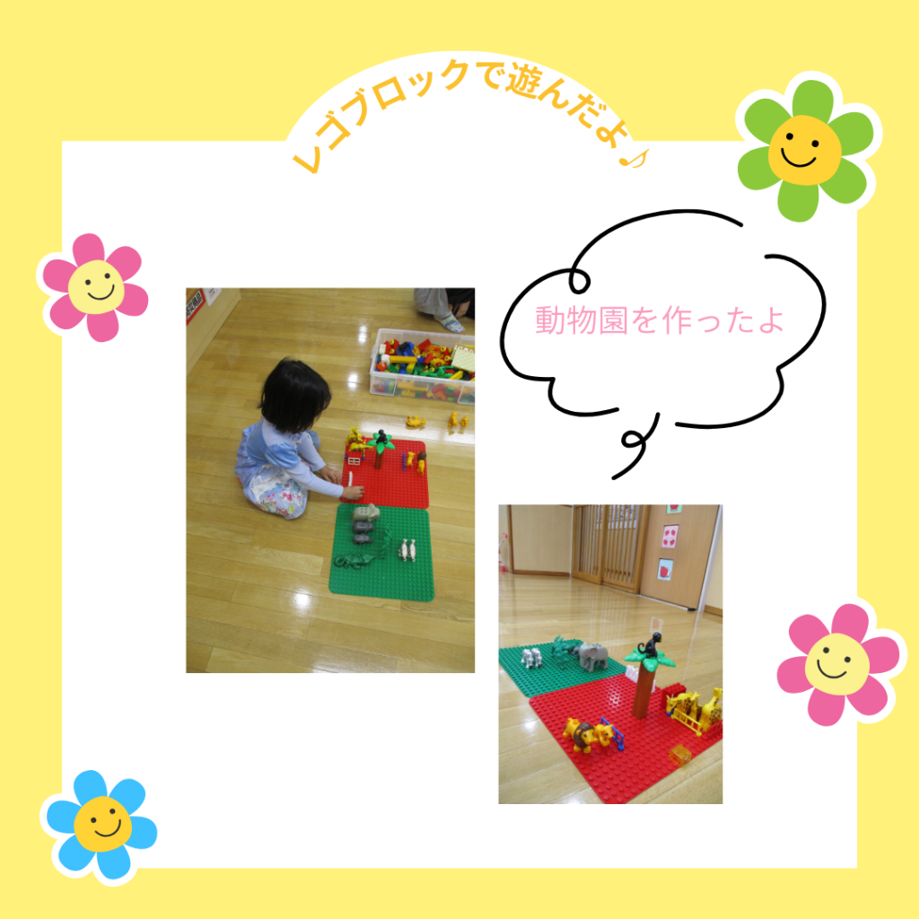 レゴコーナーでは動物園を作ったり、プラレールではすべり台をトンネルにして長く繋いだりしています。
